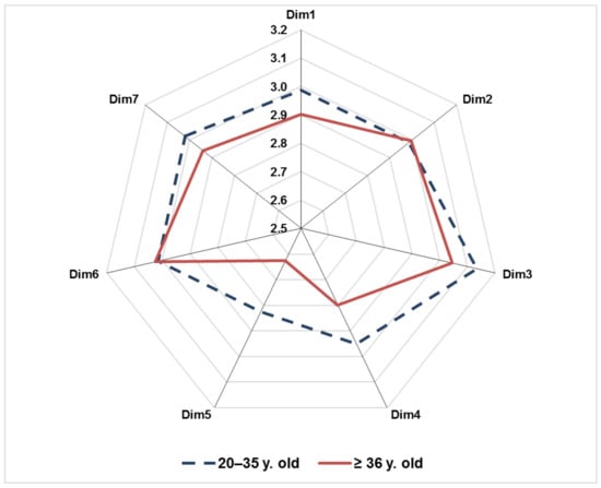 Then, a further analysis based on the respondent’s age was also carried out differentiating between farmers of 20–35 and older ones. As shown in Figure 6, the scores of SC dimensions are mostly higher for younger farmers than those for aged farmers, demonstrating a lower SC perception of the latter.