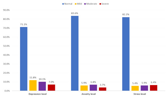 This study had some limitations that should be considered when interpreting the data. The first one we do not have a DASS-21 baseline of pre-pandemic data and detailed pre-post analyses could not be done; hence, we cannot be sure of any increase in distress levels or if any increase (if validated) was COVID-19 related. The survey provides only a snapshot of psychological responses at a particular point in time, and a longitudinal study is required to provide information on whether the observed impact will last for more extended periods. Another limitation, the quality of cohabitation was not included in this study, while it was shown to be a key variable in the psychological impact of the participants, since its poorer quality was related to higher scores of stresses [20]. The psychological self-reported effects, anxiety, depression, and stress may not adequately represent the mental health status assessed in an interview; thus, for the outcome to be determined, prospective studies are necessary to provide more accurate data to support the need for focused public mental health strategies.