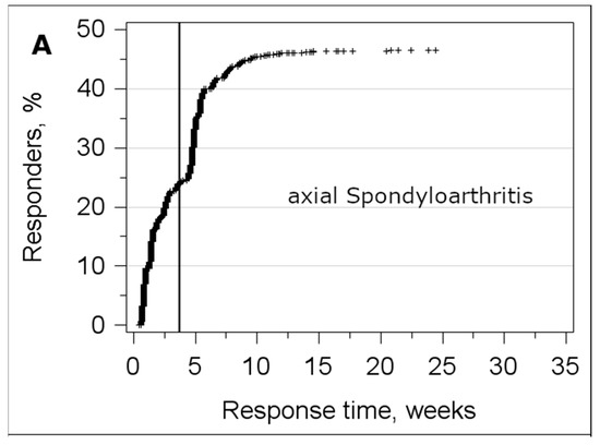 Title: Response by time. Legend: Proportion of responders by response time for (A) axial spondyloarthritis (n = 2082) and (B) osteoarthritis (n = 3550). The vertical lines mark the time when the reminders were sent.