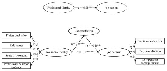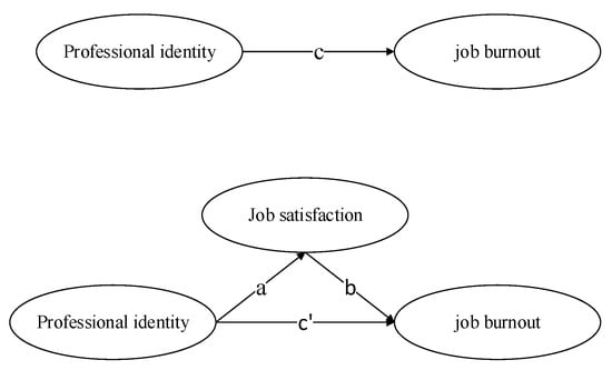The research of Goulet (2002) showed that professional identity and job satisfaction are effective factors to predict job burnout. At the same time, Laurel pointed out that job satisfaction plays a role in the influence of professional identity on job burnout [62,63]. In addition, as Aryee and Tan (1992) noted, of the three dimensions, professional identity and career resilience are generally similar to Blau’s (1985) concept of career commitment [64,65]. Therefore, this study was based on the theoretical model of career commitment. In order to explore the influence of professional identity and job satisfaction on job burnout, and to verify the role that job satisfaction may play between professional identity and job burnout, this study put forward a hypothetical model. As is shown in Figure 1, a, b, and c represent direct effect, and c’ is an indirect effect.