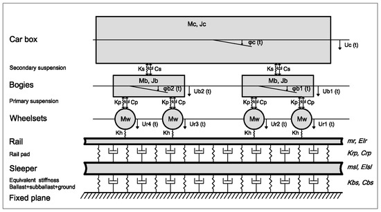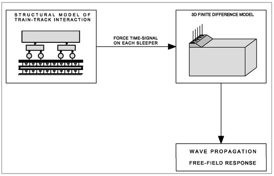 The train–track–ground interaction model has been considered as shown in Figure 2, where all masses of the train have been taken into account. In this model, the train is completely considered (including all the masses) through the rigid body dynamics method with 10 degrees of freedom. The track is simulated as a combination of masses and linear spring–dashpots, and the ballast, sub-ballast, and ground are replaced by a linear equivalent spring–dashpot. The rail and the sleepers are modelled as infinitive Euler–Bernoulli beams and the rail pad as a linear spring–dashpot. The train and track are interrelated through the wheel–rail Hertz contact. The resultant forces over the sleepers are computed and later applied in the numerical model, as summarized in Figure 1. Similar models are common in the technical literature [44] and elsewhere.
