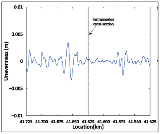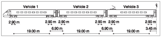 The numerical scheme used was experimentally validated on the Lisbon–Porto line, located near the town of Carregado (Portugal) by comparison between vertical vibrations at different points on the ground. These vibrations were induced by railway traffic in common traffic operations. The experimental campaign carried out at this location has been shown in several papers and consisted in measuring the following: (i) the geotechnical properties of the ground; (ii) the mechanical properties of the track (including ballast and sub-ballast); and (iii) the level of vibration induced by rail traffic in the track and in the ground. The results obtained and the details of this extensive experimental campaign can be consulted in [1,46], among others. This paper only shows the summarized properties considered for the ground (Table 1), for the track (Table 2), the profile of rail irregularities (Figure 3), and a scheme of the train (Figure 4). The Alfa Pendular train has been considered because the problem associated with railway-induced vibrations on the ground is usually limited to passenger trains (without heavy axle loads) where its high speed causes high-frequency vibrations that are perceived far away from the railway track (tens of metres). On the contrary, the highest vibrations produced by freight trains (heavy axle loads) are limited to the railway track, since its low speed implies low-frequency vibrations (<10 Hz) that are not perceived at important distances of the railway track.
