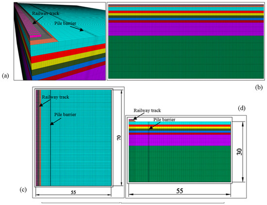 The development and application of numerical models for the study and prediction of railway vibrations has progressed significantly in recent years with outstanding models such as those presented in [1,2,3,4,5,6,7], among others. The study of mitigation measures has also received significant attention among researchers due to the negative impact of railways in terms of noise and vibrations, especially appreciable in urban environments. It is well known that these measures are applicable in three different areas: (i) in the rail tracks, with elastic mats used under the track [8], subgrade stiffening [9], and improvements in rail irregularities and wheel defects, among others; (ii) in the wave propagation path, such as open trenches and filled trenches [10,11,12,13,14,15,16] among others and buried periodic inclusions [17,18,19,20,21,22,23,24,25,26,27,28,29,30,31]; and (iii) on the building, through base isolation solutions [32].