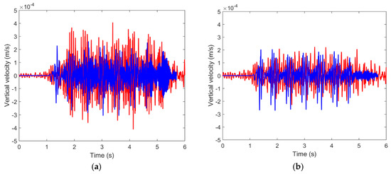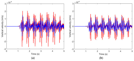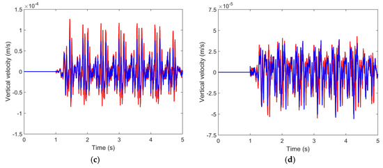 Time record of the vertical velocity at different distances: (a) 15 m; (b) 22.5 m; (c) 30 m; (d) 45 m; (red line: computed without piles; blue line: computed with tyre-derived-aggregate piles).