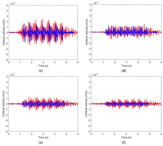 Time record of the vertical velocity at different distances: (a) 7 m; (b) 15 m; (c) 22.5 m; (d) 30 m; (e) 37.5 m; (f) 45 m; (red line: measured; blue line: numerical).