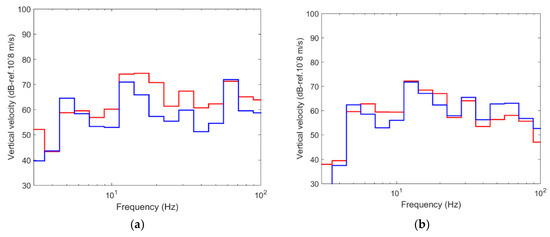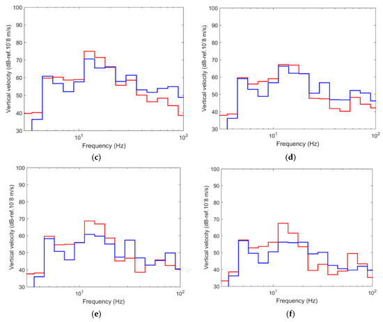 One-third octave spectra of the vertical velocity at distinct distances: (a) 7 m; (b) 15 m; (c) 22.5 m; (d) 30 m; (e) 37.5 m; (f) 45 m; (red line: measured; blue line: computed with FLAC3D).