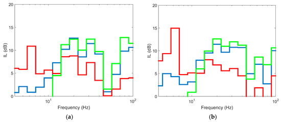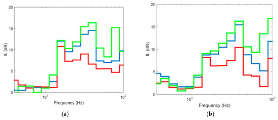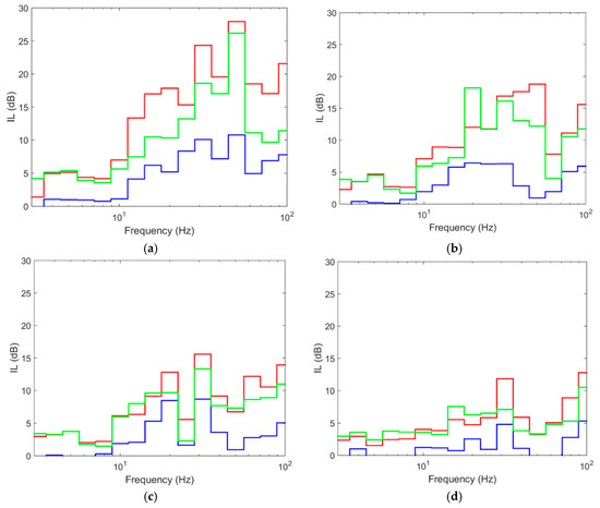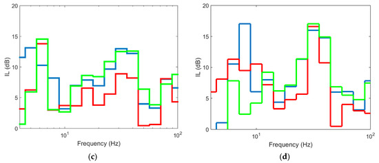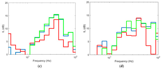 Insertion loss at different distances: (a) 15 m; (b) 22.5 m; (c) 30 m; (d) 45 m; (red line: computed with concrete piles; blue line: computed with tyre-derived-aggregate piles; green line: computed with steel tubular piles).