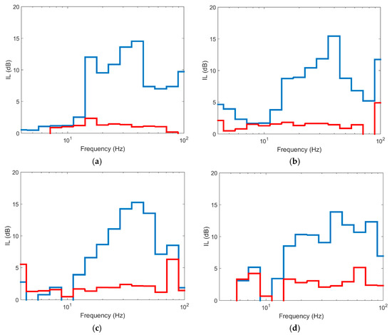 Insertion loss at different points in section to 30 m: (a) P5; (b) P6; (c) P7; (d) P8 (red line: pile spacing 2D; blue line: pile spacing 1D).