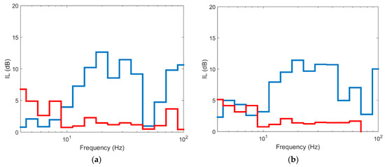 A clearer analysis can be obtained from Figure 17, which shows the IL value caused by the barrier. It can be seen that the reduction reaches 10 dB in some frequency bands and that the mitigation decreases as the distance to the barrier increases. In particular, the IL values for points located closest to the barrier (15, 22.5, and 30 m from the track axis) are between 0 and 10 dB, and the frequency band between 15 and 60 Hz is the most damped. In addition, it is observed that for frequencies of up to 12 Hz, the mitigation effect is very low since wavelengths corresponding to lower frequencies are larger than the depth of the barrier. At the point located 45 m from the axis of the track, the mitigation effect of the barrier is negligible.