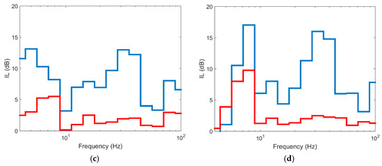 Insertion loss at different points in section to 15 m: (a) P1; (b) P2; (c) P3; (d) P4 (red line: pile spacing 2D; blue line: pile spacing 1D).