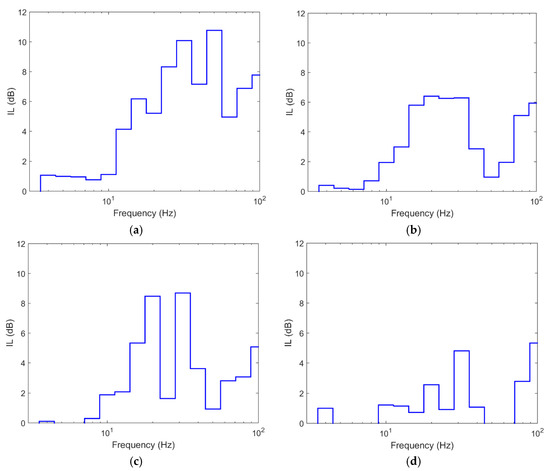 Insertion loss at different distances: (a) 15 m; (b) 22.5 m; (c) 30 m; (d) 45 m.