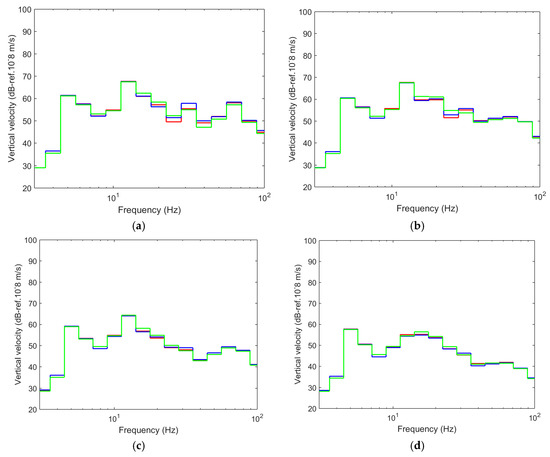 One-third octave spectra of the vertical velocity at distinct distances: (a) 15 m; (b) 22.5 m; (c) 30 m; (d) 45 m; (red line: linear isotropic; blue line: nonlinear isotropic; green line: linear anisotropic).