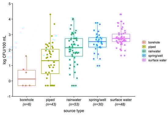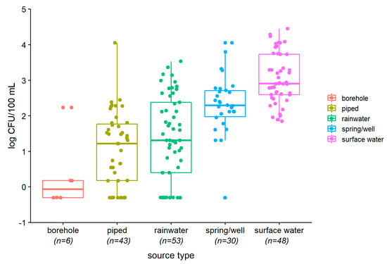 Boxplots showing levels (colony-forming units (CFU)/100 mL) of E. coli by source type (superimposed dots show bacteria counts for individual samples).
