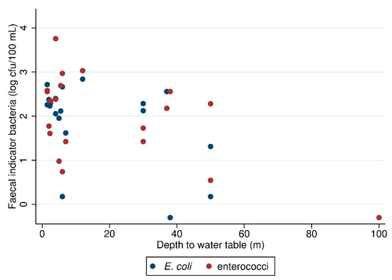 Aside from sanitary risk scores, depth to water table were significantly related to FIB contamination. Vertical separation between groundwater and surface hazards is known to reduce risks of microbial contamination through bacteria attenuation during water transport through the soil matrix [31], as identified in previous studies. A study of Bangladeshi tubewells found that water table depth predicted contamination, but the structural integrity of the well platform did not predict E. coli contamination [32]. In rural Kenyan wells, both water table depth and sanitary risk observations predicted such contamination [33]. Since we found significantly lower E. coli and intestinal enterococci counts in wells deeper than 40 m (Figure 3), this suggests that investment in depth probe equipment for field teams is justified as an objective means of characterizing shallow well contamination risk.