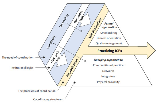 The analytical and research-based concepts we have introduced to interpret the performance of coordination through ICP in hospitals are expressed in Figure 1. Uncertainty is framing relatively complex processes embedded in a mixture of several logics. Here the coordination accomplished in ICP unfolds in a combination of standardization and improvisation and through two types of structures—the formal and the emerging elements.