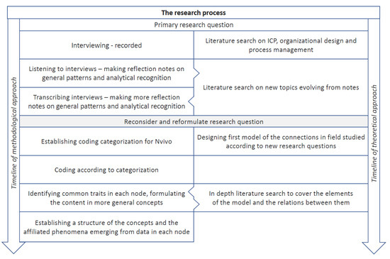 The initial focus of this study was the ICP phenomenon as a complex yet standardized set of procedures connected to the patients’ pathway through diagnostic and treatment episodes in and between hospitals. In the matrix structure made by the process-oriented ICP and the medical specialty-based line organization, we anticipated a tension between the process orientation and the formal organization. We wanted to describe how this tension was playing out and possibly being resolved. However, in a process that has been previously described in qualitative research [99,100], through careful listening to and analyzing the interviews we gradually had to reconsider what actually happened in the field and reinterpret what practicing ICP was about. We began to question the degree of standardization present and the role it played in accomplishing the coordination we observed. Parallel to this, we also questioned the role formal organizational structures played when dealing with horizontal coordination. At the same time, the coordination challenges between the vertical levels in the matrix were confirmed. However, the key challenge reported was not, as initially assumed, the lack of alignment between the formal organization structure and the horizontal ICP process. Based on this, we had to fundamentally reassess our initial research questions. We decided instead to describe the way ICPs unfold as an interplay between standardization and improvisation. To see how this dynamic played out in the real world, we identified several informal organizing elements and explored how they connected to formal hierarchical hospital structures. This abductive research process [101] is schematically described in Figure 2 and resembles what is labelled flexible pattern matching [102].