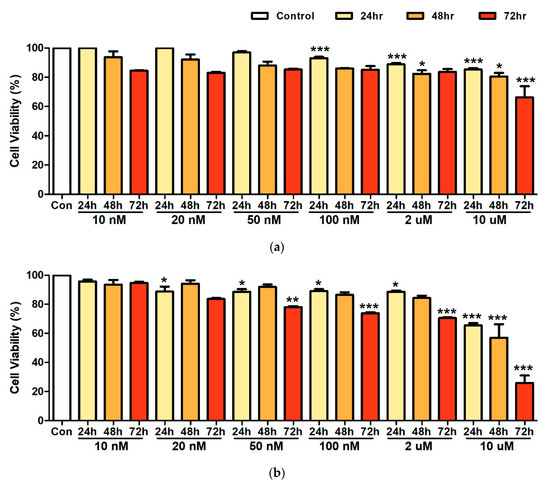 The human lung cancer A549 cell and the murine macrophage Raw264.7 cell were obtained from Virus Laboratory of the Ulsan University. Cultures of the A549 and Raw264.7 cell lines were maintained in RPMI 1640 or DMEM media (Gibco, CA, USA) supplemented with 10% fetal bovine serum (FBS, Gibco, CA, USA), 1% penicillin-streptomycin solution, 1% l-glutamine, and 1% nonessential amino acids and cultured at 37 °C and 5% CO2, respectively.