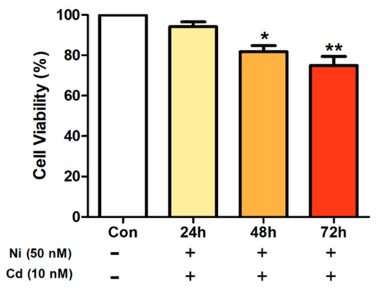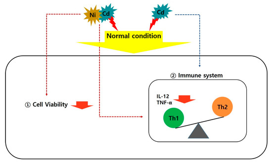 In general, there are many types of heavy metals that can contribute to environmental exposure, especially nickel (Ni) and cadmium (Cd), which have cellular and immune system toxicity [8,9]. Previous studies have shown that cell viability decreases, and inflammatory cytokines increases, in response to Ni and Cd exposure [10,11,12,13,14,15]. However, due to the nature of environmental exposure, it is possible to be exposed to lower concentrations than reported, and there is a high risk of chronic or mixed exposure. Nevertheless, studies on the effects of low concentrations of Ni and Cd at the cellular level and mixed exposure are limited.