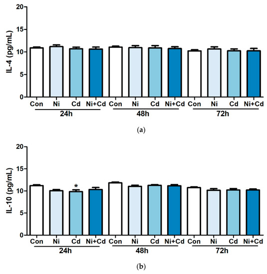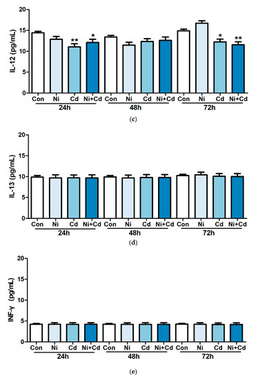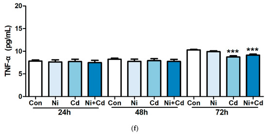 The release of cytokines was measured using an ELISA kit (R&D Systems Inc., Minneapolis, MN, USA). Raw264.7 cells were seeded in 24-well plates at a density of 2 × 104/mL and treated with Ni (50 nM), Cd (10 nM), and a mixture of Ni and Cd, and then incubated for 24, 48, and 72 h at 37 °C and 5% CO2. The control was identical to the test samples, except for the addition of heavy metals. The concentration of cytokines (IL-4, IL-10, IL-12, IL-13, INF-γ, and TNF-α) was measured in the supernatant. The absorbance of control and test samples was quantified at 450 nm using a microplate reader (SpectraMax iD3, Molecular Devices, Shanghai, China). All groups were tested independently over time and were tested in duplicates at least 5 times.