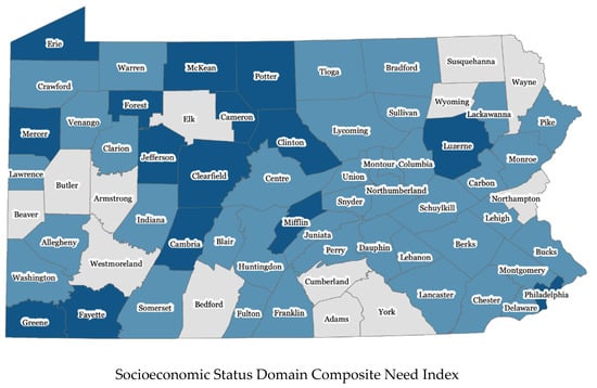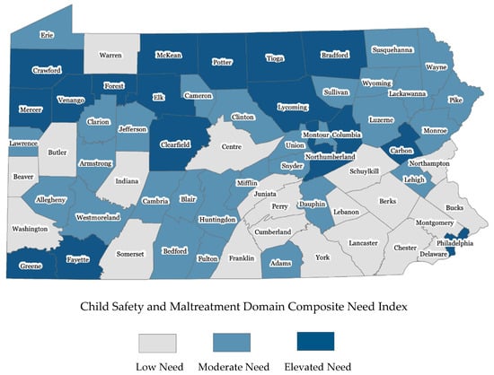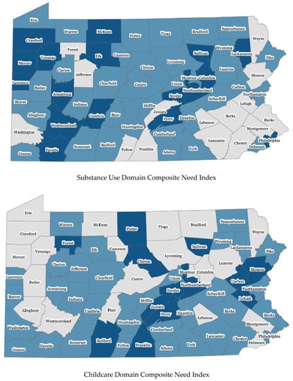 In addition to the above two domains, we used the same approach and calculated the composite domain need indices for the other four domains. Figure 1 presents the composite need indices of each county on the Socioeconomic Status Domain, Substance Use Domain, Childcare Domain, and Child Safety and Maltreatment Domain. Of the 67 counties in Pennsylvania, 23 counties did not meet the elevated need threshold for any of the six domains, 44 counties reached elevated need status in at least one domain, and 15 counties met elevated need thresholds in three or more domains. Concentrations of need were dispersed across rural, urban, and suburban counties in the state.