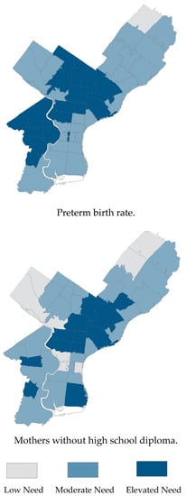 In this needs assessment, we incorporated SDOH through a range of environmental, political, economic, social and structural factors linked to maternal and child health outcomes. In particular, we incorporated measures for which there is evidence of interventions to reduce social inequalities in health: stress, early life, social exclusion, work, employment, social support, food, and transportation []. Although there is no simple solution to the complex problem of health disparities, promising and knowledge-based directions for action have been explored, including economic development initiatives targeting and engaging disadvantaged communities, community-focused initiatives that can lead to healthier communities, federal grant programs targeted to provide comprehensive family planning services and preventive health services [], and home visitation programs giving pregnant women and families, particularly those considered at-risk, necessary resources and skills to be physically and emotionally healthy []. For example, the Best Babies Zone (BBZ) Initiative is a collaborative, place-based effort to mobilize four sectors—healthcare, early care and education, economic development, and community systems—to address the social determinants of health and improve birth outcomes []. BBZ works holistically to improve living conditions and opportunities for families by aligning resources, building community leadership, and transforming educational opportunities, economic development, and community systems in concentrated neighborhoods.