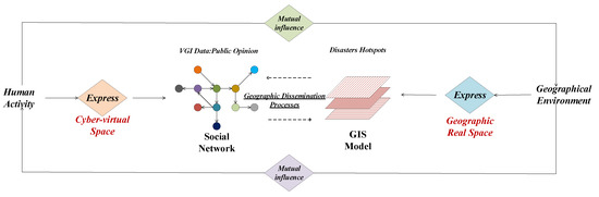 We take the COVID-19 epidemic event as the background to further understand the magnitude and distribution of the spatial impact of this major public security event, and construct a spatial impact evaluation model of the epidemic based on the reciprocal relationship between network activities and the geographic environment, including users’ network activities such as check-in information, concern information, interaction information, emotional information. This will help to quantify the spatially coupled impact of public opinion and disasters, detect epidemic hotspots, refine the geographic dissemination processes of major public health events, and establish the relationship between cyber-virtual space and geographic real space.