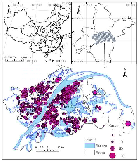 The coordinate system of all spatial data in this paper is the China Geodetic Coordinate System 2000 (CGCS2000). We plotted the geographic location of Wuhan in Figure 2.