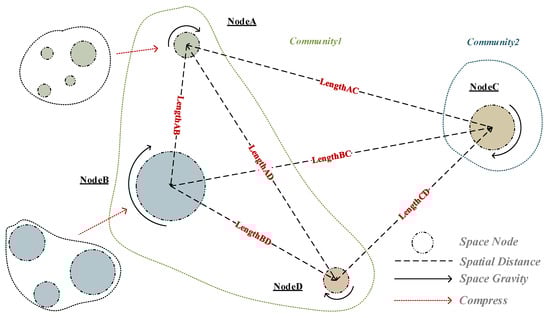 The model treats each cell as an independent community with the same initial number of communities as the number of nodes. On this basis, all nodes are fused and coalesced based on the modularity gain until the local maximum of modularity is reached, i.e., no node can increase the network modularity, and the community structure is no longer changed. Finally, the community results are compressed by converting their internal node weights into new nodes and weights, and the weights of the original inter-community edges are converted into inter-node weights [42,43]. The algorithm is illustrated in Figure 3.