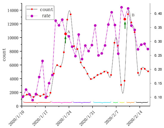 Based on natural language processing (NLP) techniques, the collected data were categorized into negative, positive, and neutral, and the daily percentage of negative sentiment Weibos were plotted together as shown in Figure 4, where the proportion of negative sentiment reached a maximum of nearly 45% before and after the full suspected patient intake policy was implemented, and then it began to decline.