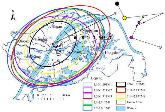 According to the above-mentioned stages of public opinion evolution, we calculated the 1 standard deviation directional distribution of Weibos in different stages, as shown in Figure 5 and the graph in the upper right corner of it, where the size of the nodes represents the number of check-ins. Stage 1 shows a northwest-southeast directional distribution, with the geographic discussion center in the Sha lake area of Wuchang District; stage 2, the discussion of the climbing period, shows a shift of the geographic center of gravity towards Jianghan District; stages 3, 4, and 5 show a similar directional distribution as the center of gravity; stage 6, the discussion of the trough period, shows a more scattered distribution and a shift of the center of gravity towards the Qingshan District; stages 7 and 8 show a more compact directional distribution, with the geographic center of gravity shifting across the Yangtze River to the other side area. The check-in information in cyberspace is closely related to the population distribution, and an important time point is around 23 January, when the direction is southeast-northwest and then reverses.