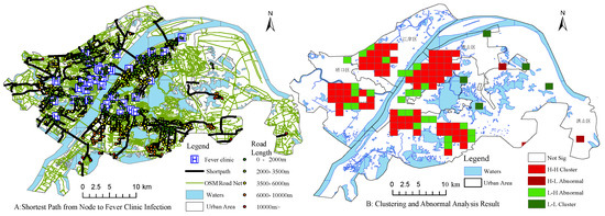 Spatial analysis of the epidemic community. (A) Shortest distance and shortest path from node to fever clinic infection. (B) Clustering and abnormal analysis ( confidence level).