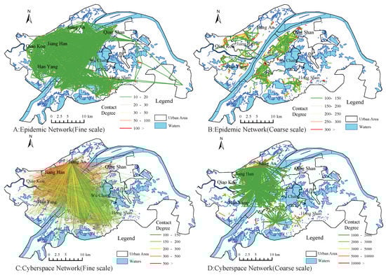 We classify all nodes into 5 levels, from low (Level 1) to high (Level 5), according to their degree values. In Figure 10A, we can see that the distribution of nodes in the POI network is hierarchical, with a large number of Level 5 nodes in the northern part of the Han River and the western part of the Yangtze River, in a decreasing ring shape. The mentioned area is densely populated and affluent, and is a well-known commercial and financial center of Wuhan. In addition, there are a number of POIs, such as the infectious disease hospital, which is the first line of defense against the epidemic, and the South China Seafood Market, where the SARS-CoV-2 virus has been found, which generated a great deal of discussions during the study period. Correspondingly, there are multiple clusters in the real space community network (Figure 10B), and the degree peaks appear in the cluster center to show multi-community distribution. That is to say, there are multiple regions with degree peaks, which also reveals the geographic transmission characteristics of COVID-19, the multicenter distribution is very likely to trigger mass infection.