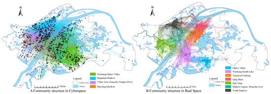 The results of Louvain’s algorithm are shown in Figure 8, node in real space was divided into seven major communities with very distinct structures, namely, Optics valley, Wuchang-South Lake, Yuejiazui-Xudong, QingShan, HanYang, HanKow region along the river, and North Hankow. The geographical barriers such as Yangtze River and East Lake have a clear watershed effect on the community structure, as opposed to administrative divisions, which do not have significant effects. The influence within the community is much higher than that of the nodes between the communities, and the final division of the modularity is 0.793, showing a strong complex network of community structure.