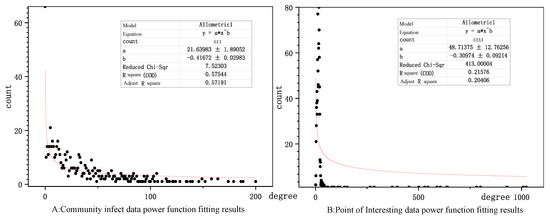 We discuss the scale-free characteristics of the two networks in Figure 9. The scale-free characteristics of the epidemic network are more pronounced, with a fitted of 0.572, indicating that except for a few communities with more severe impact, the remaining communities are less infected, and the city closure measures have curbed the spread of the virus in time [50,51]. In contrast, the POI network showed a weaker scale-free feature with a fitted of 0.204, indicating that the network information spreads more uniformly in space and has a larger range of influence. Thus, there is no clear indication that Wuhan residents in infected areas focus their attention on certain (few) points of interest.