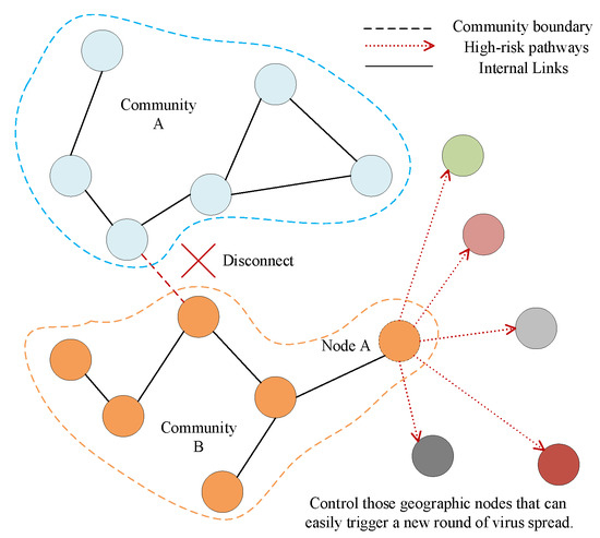 We mentioned in Section 3.4 that a node with high betweenness centrality has a large influence on the spread of virus through the network. The more nodes with high betweenness centrality, the easier it is for the virus to spread and the faster the number of people diagnosed will rise. So it is an effective way to stop a new round of virus spread through controlling these geographic nodes. In addition, complex networks are tightly connected within communities and sparsely connected between communities, which opens up possibilities for prevention and control. By controlling a few strong connections between communities, we can effectively prevent cross-infection and transmission between communities as shown in Figure 11.