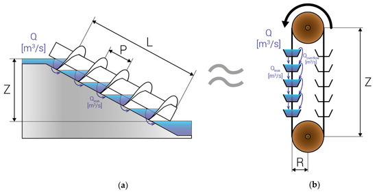 Analogy between Archimedean screw turbine (AST) and bucket elevator. (a) AST; (b) bucket elevator.