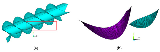 The geometrical model of the AST is shown in Figure 2a. To study the effect of the filling of the buckets, only one bucket was studied. The numerical model is shown in Figure 2b. The type of finite structural element used to simulate the flights was SHELL93 [14]. This element is suitable for modeling curved shells. It has six degrees of freedom at each node: translations in x, y and z and rotations about x, y and z.