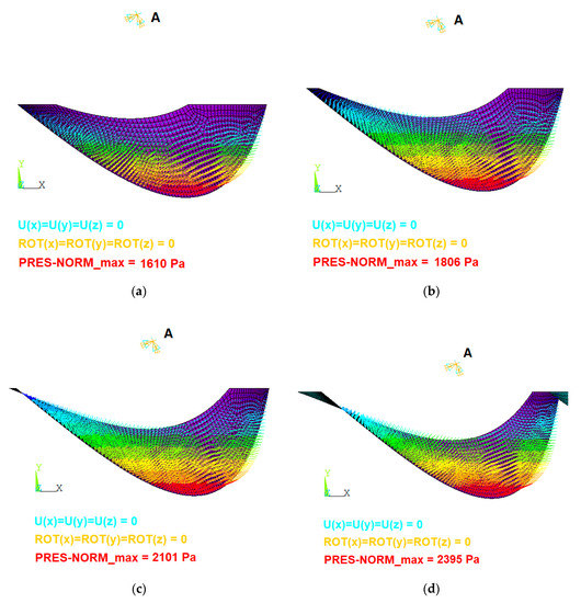 Node A is in the axis of the screw. Displacements and rotations at node A were avoided. The filling of the bucket was modeled by applying the fluid pressure normal to the surface. The surface was obtained from the geometrical model and the value of the normal pressure depends on the filling level.