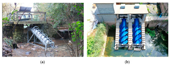 AST experimental prototypes. (a) Atlantic Botanic Garden of Gijón (Spain); (b) Barreda hydroelectric plant in Torrelavega (Spain).