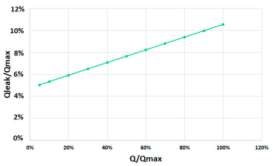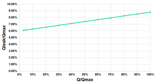 Leakage losses were also obtained for this real prototype. The real-scale prototype showed similar behavior to the small-scale prototype in experimental tests. Figure 10 shows the percentage of leakage losses in the real-scale prototype. In this turbine, static leakage losses were around 6%. Although the leakage losses for low flows were higher than those in small-scale prototypes, the increase of losses was smaller than in the small-scale prototype. For the small-scale prototype, the leakage losses at the design flow were around 10% (see Figure 8). However, the real-scale prototype had leakage losses below 9% (see Figure 10).