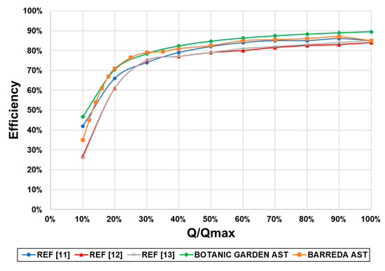 The efficiency curves of the prototypes studied in this work were compared with previously published curves from previously installed ASTs [11,12,13]. Figure 11 shows a comparison of efficiency curves for five ASTs already installed. The ASTs designed in this work provided high efficiencies even for low flow percentages. For a flow ratio around 20%, the efficiency improved by between 5% and 10% in comparison with other ASTs. This improvement in hydraulic efficiency provides a significant increase in the total efficiency of these turbines.