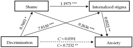A serial mediation analysis of shame and internalized stigma on discrimination to anxiety. * p < 0.05, ** p < 0.01, *** p < 0.001. C: direct effect without mediators; C’: direct effect with the mediators of shame and internalized stigma.