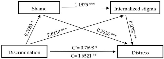 A serial mediation analysis of shame and internalized stigma on discrimination to distress. * p < 0.05, ** p < 0.01, *** p < 0.001.