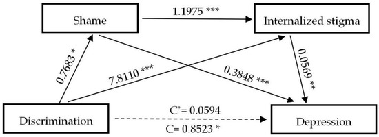 A serial mediation analysis of shame and internalized stigma on discrimination to depression. * p < 0.05, ** p < 0.01, *** p < 0.001.