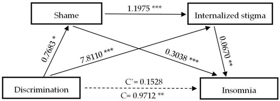 A serial mediation analysis of shame and internalized stigma on discrimination to insomnia. * p < 0.05, ** p < 0.01, *** p < 0.001.