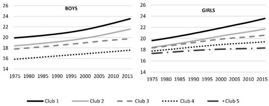 Figure 1 shows the evolution of BMI during 1975–2016. For boys, Club 1 exceeds the average of Club 2 by 1.5 points at the beginning of the sample period, although this gap is amplified to 2 points in 2016. It is also worth noting that, as time passes, Clubs 1 and 2 increase the distance from Clubs 3 and 4, with lower BMIs. The most industrialized countries are mostly concentrated in Club 3.