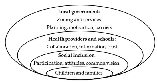 This study addresses a critical gap in the literature—the role of local government in improving child health through planning, zoning and services. We give special attention to participation and inclusion, and we measure collaboration across health-related agencies at the community level. Our human ecological approach provides a framework to assess the social determinants of health and the role of community level institutions in creating healthy places for children. We explore how the different layers in the human ecology framework (Figure 1) are related to build healthy places for children.