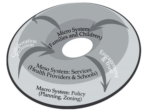 Our study makes an important contribution to human ecological theory. While prior studies have articulated human ecology as a hierarchy of institutional layers that affect child welfare [,], we see a more dynamic process. See Figure 2. Our models explore the dynamics between the micro layer of children and families, the meso layer of services, and the macro layer of policy (zoning, planning). In this dynamic model, local governments, through collaboration and inclusion, coordinate with the meso system of service providers to reach the micro system of children and families. But this is not a one-way process. Through engagement and trust, children and families can reach up from the micro layer to the meso system of service providers, and affect macro policies of planning, zoning, and service delivery. Such dynamic models of active citizenship have been shown to enhance family wellbeing in other international contexts [,].