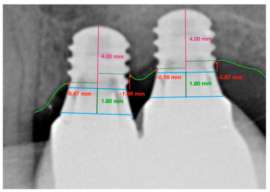 • Two reference points were located (clearly visible in radiographs and easily reproducible) at the join between the implant and the prosthetic crown, i.e., the line representing the prosthetic platform.