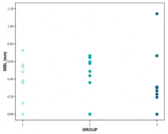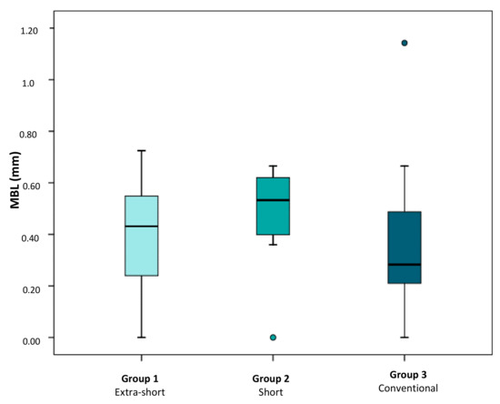Figure 5. Distribution of MBL (mean bone level) average values per patient in groups 1 (extra-short), 2 (short) and 3 (conventional).